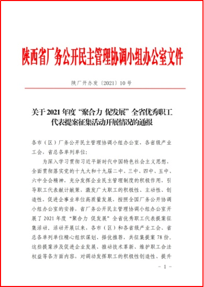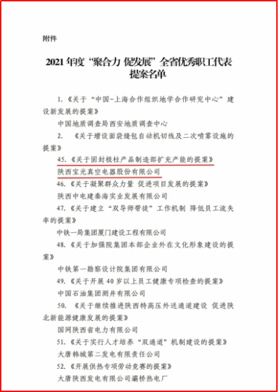 近日,从陕西省总工会传来喜讯,6686体育官网集团《关于固封极柱产品制造部扩充产能的提案》荣获陕西省2021年度“聚合力 促发展”全省优秀职工代表提案。