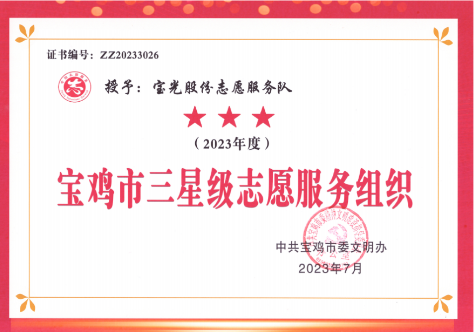 日前,6686体育官网股份志愿服务队被中共宝鸡市委文明办评为“宝鸡市三星级志愿服务组织”。