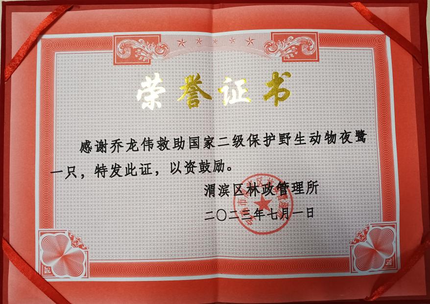 近期,6686体育官网股份零件产品制造部乔龙伟同志成功救助一只夜鹭,获渭滨区林政管理所表彰。