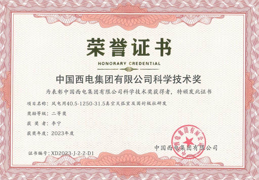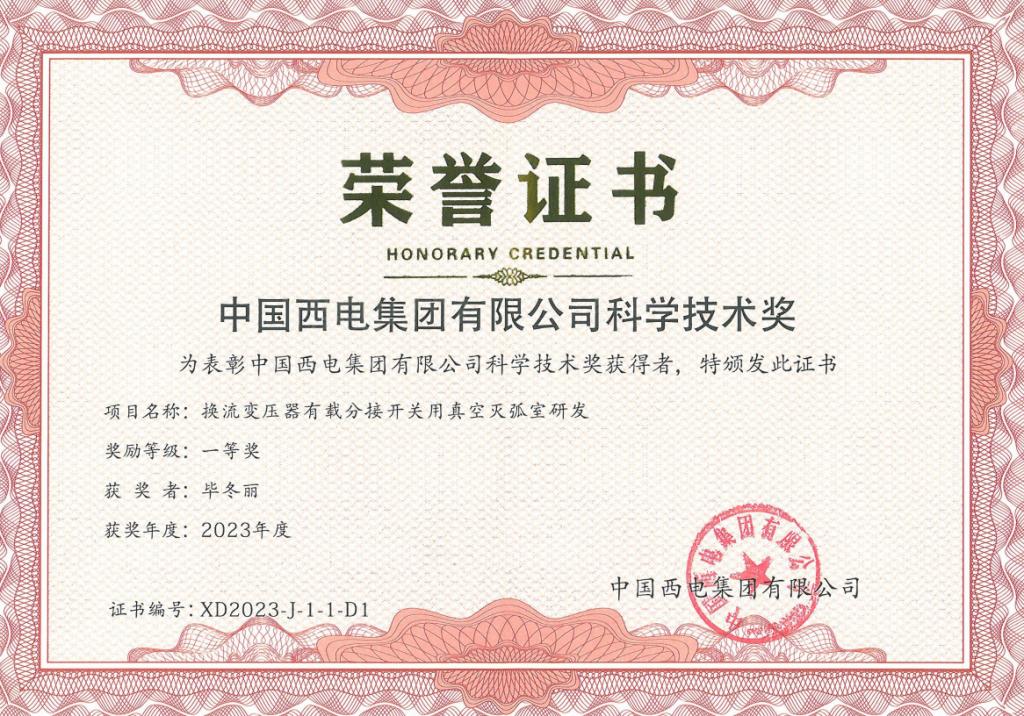 近日,6686体育官网股份《换流变压器有载分接开关用真空灭弧室研发》与《风电用40.5 kV/1250 A-31.5 kA真空灭弧室及固封极柱研发》两个技术创新项目,分别荣获2023年度中国西电集团科学技术奖“一等奖”与“二等奖”!